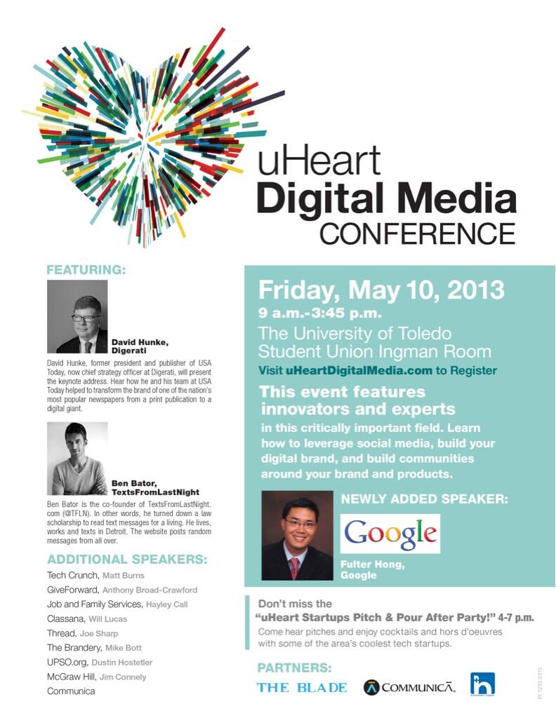 April 22nd, 2013 by Meghan CunninghamThe University of Toledo’s May 10 uHeart Digital Media Conference has added a household name from the digital media world to its long list of speakers who are leaders in their field.